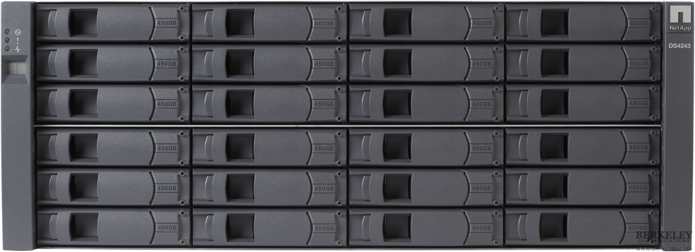Berkeley Communications would like to introduce the newest member of the NetAppdisk shelf family; the capacity-optimized DS4486, which holds 144TB of high-capacity disk drives. This disk shelf looks like the DS4243 from the front but it is slightly longer and uses a tandem disk carrier to enclose twice as many (48) 3.5" disk drives into 4U of rack space.